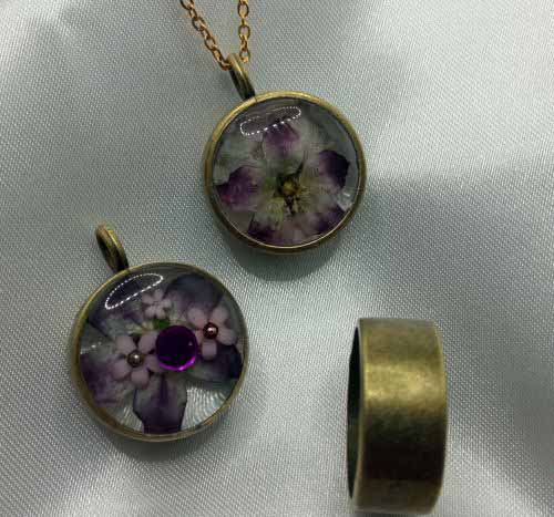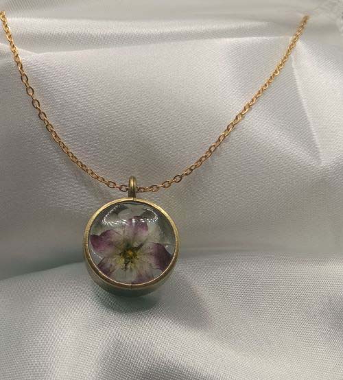 Médaillon épais de type laiton incrusté de fleurs et autres éléments de décors suivant le modèle. Il est accompagné d’une chainette de même couleur. Ce médaillon a la particularité de présenter 2 faces différentes à porter selon vos envies.