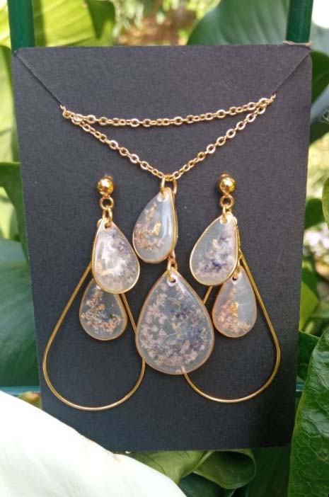 Parure comprenant des boucles d’oreilles et un collier. Les éléments sont composées de deux gouttes dorées qui contiennent tous de très petites fleurs rose pastel incrustées dans la résine époxy.